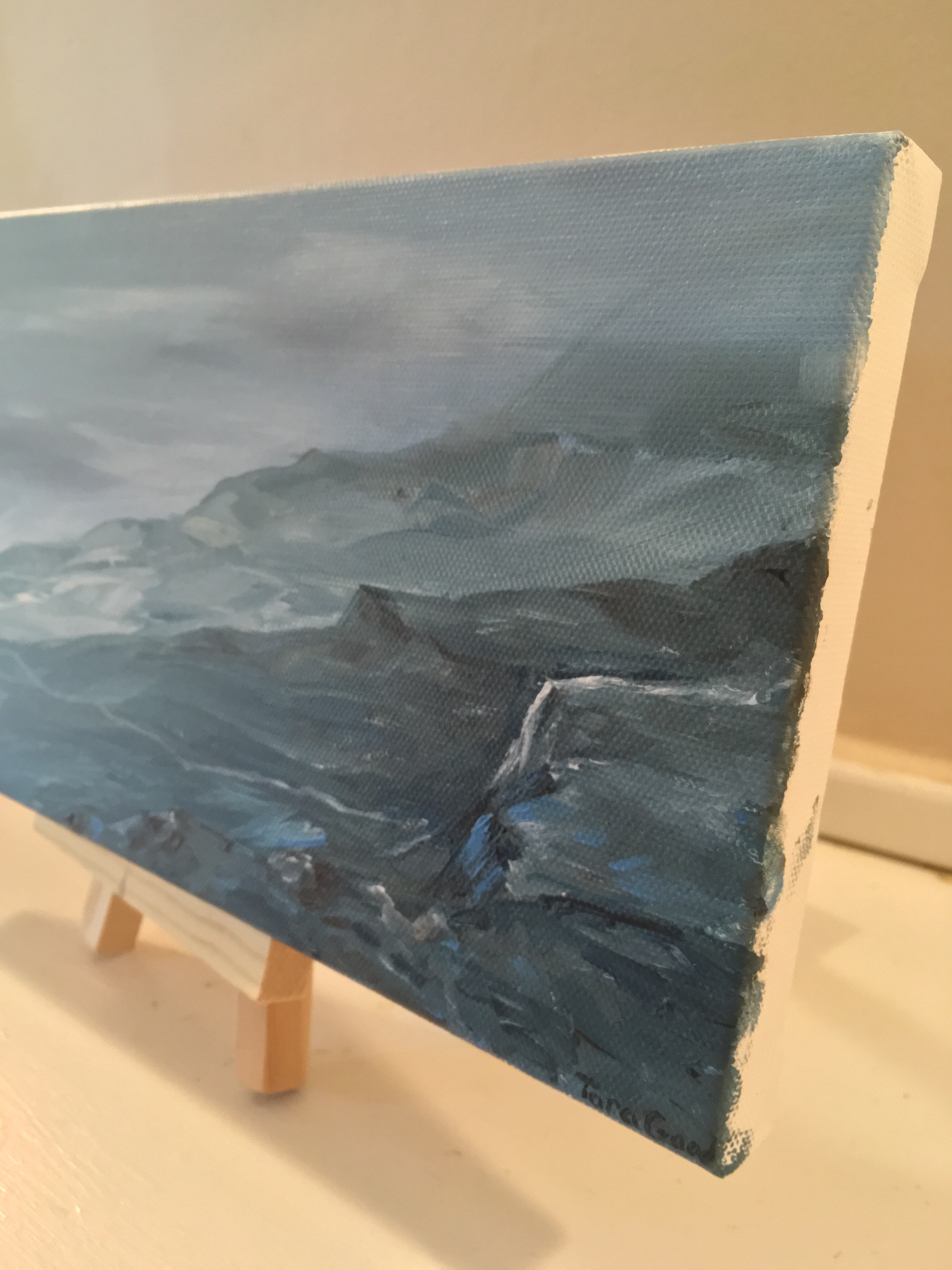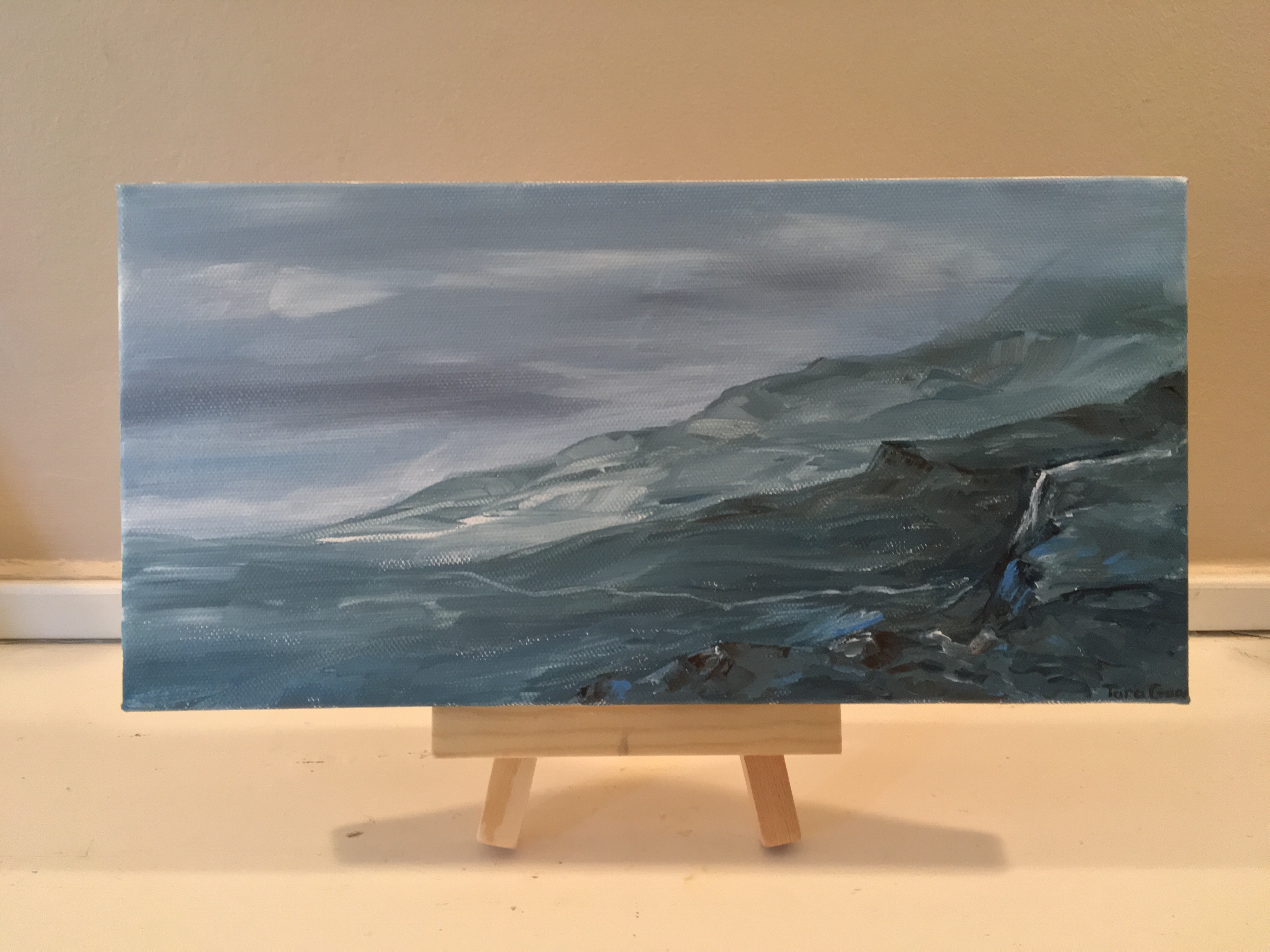 This painting is inspired by a trip to Iceland I took with my now husband in 2015. While driving along the eastern coast we had to go up into the mountains before descending back to the southern coast. The drive was covered in fog, but as we descended, it felt as though we were moving through the clouds while the landscape slowly appeared